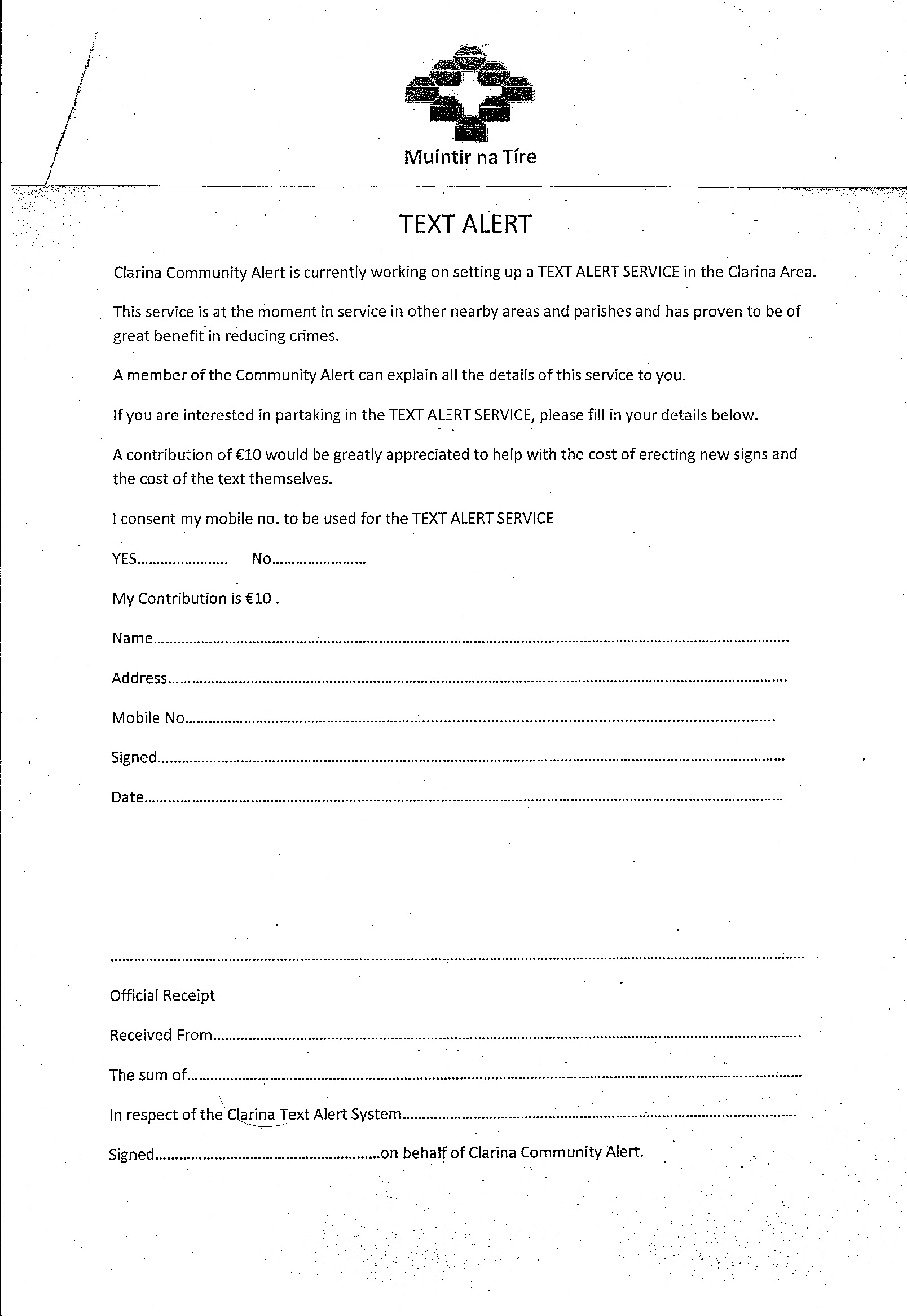 The Community Text alert system in conjunction with An Garda Siochana and Munitir na Tire is about to be set up.If anyone in the area wish to receive texts in relation to any suspicious activity they can contact any member of the Community alert Committee or attend the Community Resource on Monday 1st September 8:30pm.